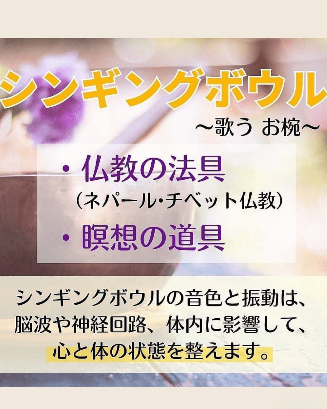 シンギングボウルの音は、 命の源泉に触れる“音の鼓動”。 それは言葉を超え、 細胞の奥深くへと響き渡ります。